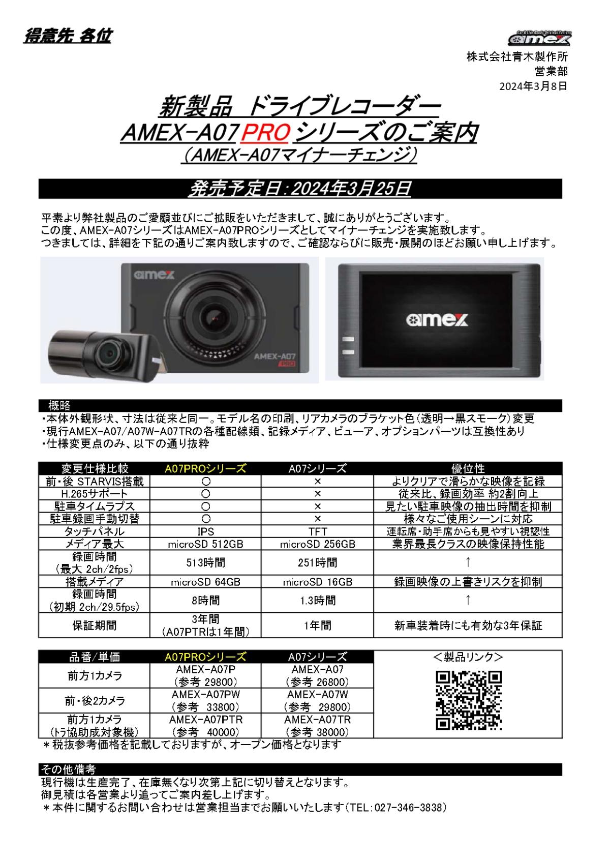 新製品 ドライブレコーダー AMEX-A07PROシリーズのご案内
