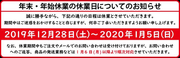 誠に勝手ながら、2019年12月28日(土)~2020年1月5日(日)の9日間を弊社の年末年始休業とさせていただきます。